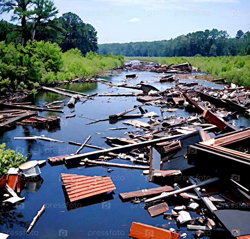 Куча мусора, загрязнение водоема ИИ