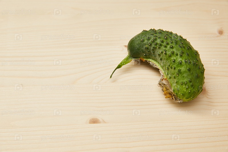 Органический уродливый огурец на светлом деревянном фоне, вид сверху. Копировать пространство
