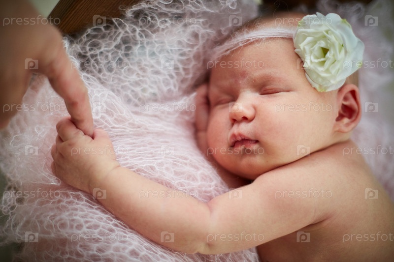 Очаровательный новорожденный ребенок с цветком на голове спит на розовом вязаном пледе, держит мамин палец