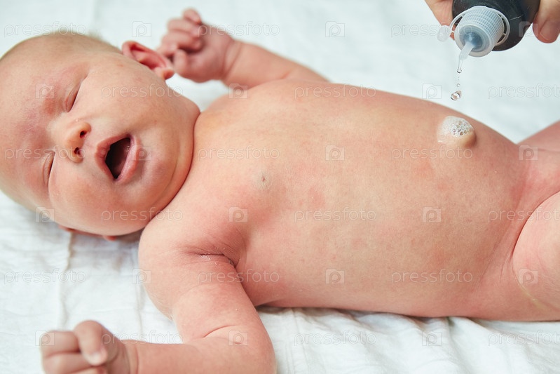 Врач или мать моет или обрабатывает пупок новорожденному ребенку
