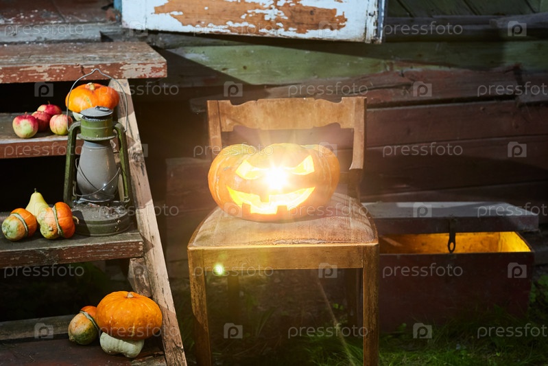 Хэллоуинский тыквенный Джек сидит на стуле рядом с маленькими тыквами на лестнице