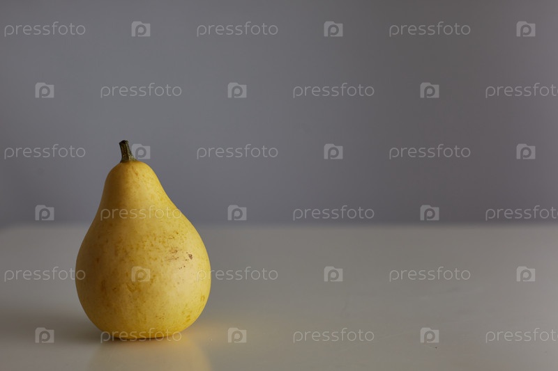 Декоративная желтая тыква стоит на пустом столе. место для текста. горизонтальное изображение
