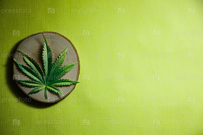 Лист конопли на деревянной пиле. Место для текста