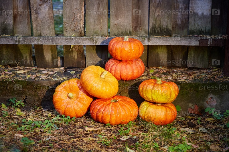 Тыквы на заборе сложены в виде дешевого декора для Хэллоуина, празднования праздника