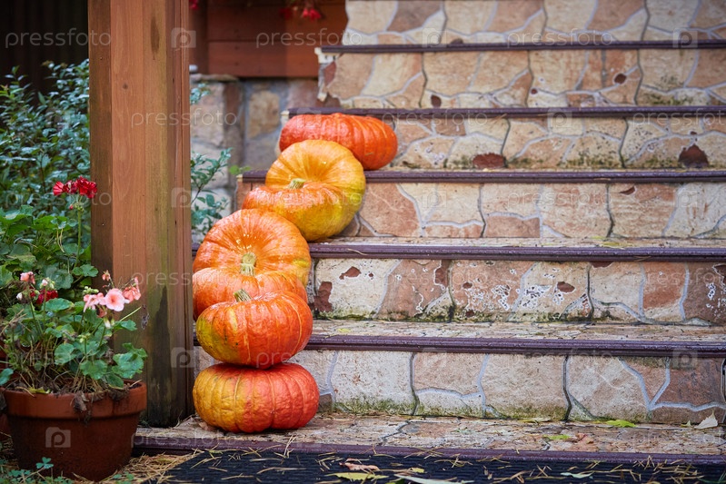 Тыквы на ступеньках дома. Украшения для празднования Хэллоуина