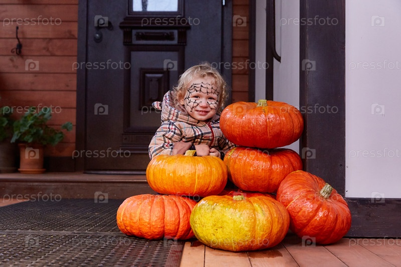 Улыбающаяся девочка сидит рядом с тыквами возле двери дома. Декор на Хэллоуин. Копировать пространство