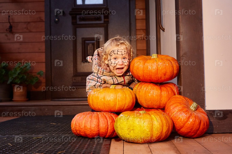Улыбающаяся девочка сидит рядом с тыквами возле двери дома. Декор на Хэллоуин. Копировать пространство