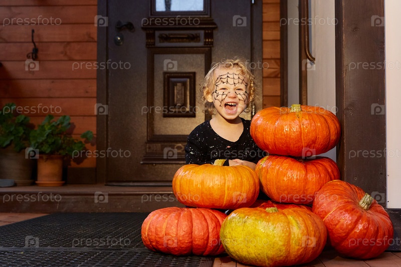 Улыбающаяся девочка сидит рядом с тыквами возле двери дома. Декор на Хэллоуин