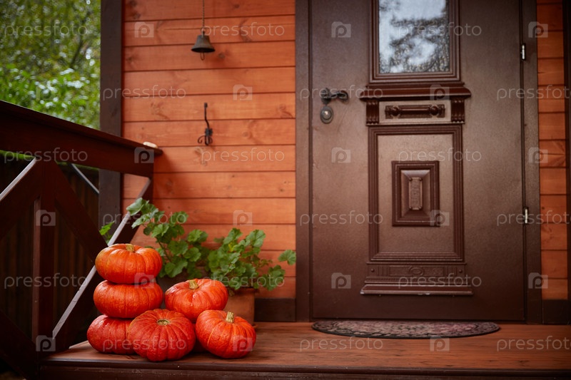 Декор дома на Хэллоуин. Сложите тыквы возле двери дома. Осенний урожай