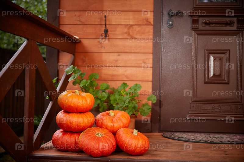 Стопка больших оранжевых тыкв Возле двери дома. Осенний урожай и декор дома на Хэллоуин. Копировать пространство