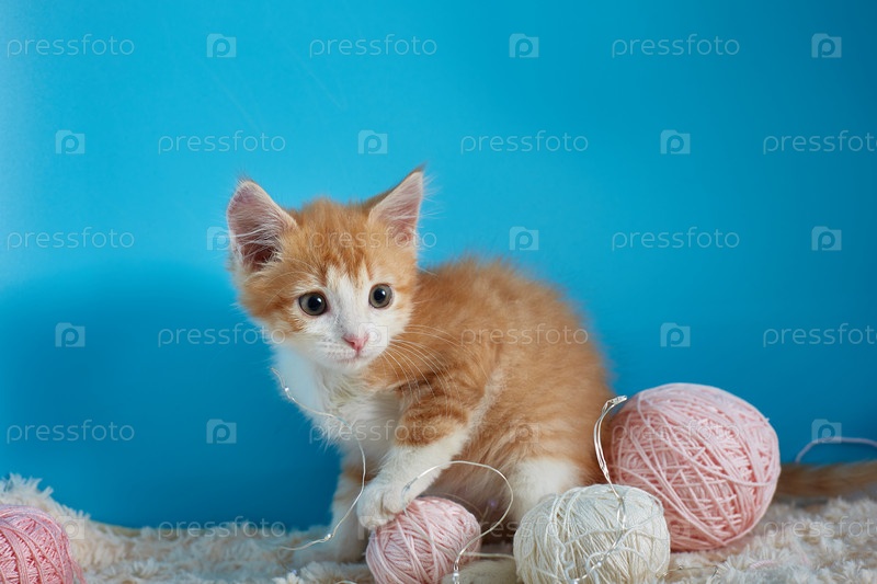 Милый котенок сидит рядом с клубками шерсти