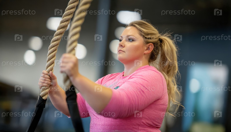 Женщина плюс-size сосредоточена на тренировках с веревками в тренажерном зале, демонстрируя силу и решимость