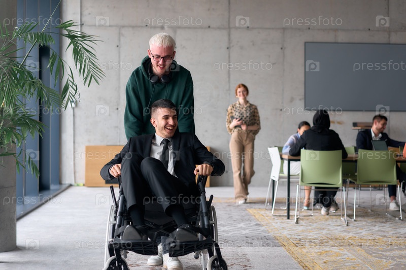 Сотрудник развлекает директора в инвалидной коляске, катаясь по офису со смехом и радостью