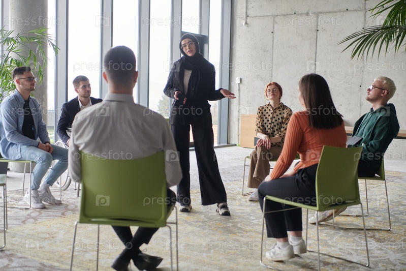 Корпоративная встреча бизнес-команды с менеджером или тренером. Группа счастливых разнообразных, многорасовых людей, сидящих в кругу