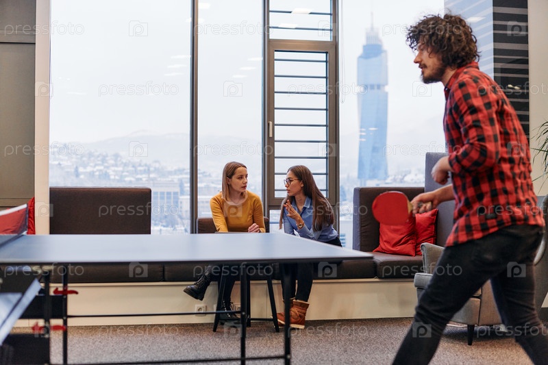 Коллеги по бизнесу отдыхают от работы, чтобы поиграть в настольный теннис, способствуя командной работе и товариществу на рабочем месте