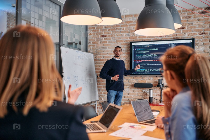Афроамериканский бизнесмен проводит совещание, страстно представляя бизнес-план своей внимательной команде, способствуя сотрудничеству и стратегическому мышлению