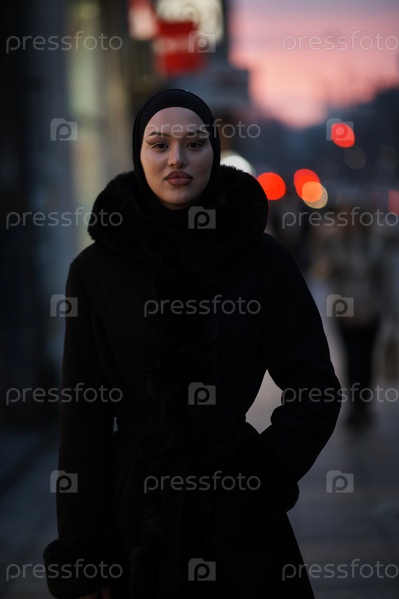 Мусульманка идет по городской улице холодной зимней ночью в хиджабе
