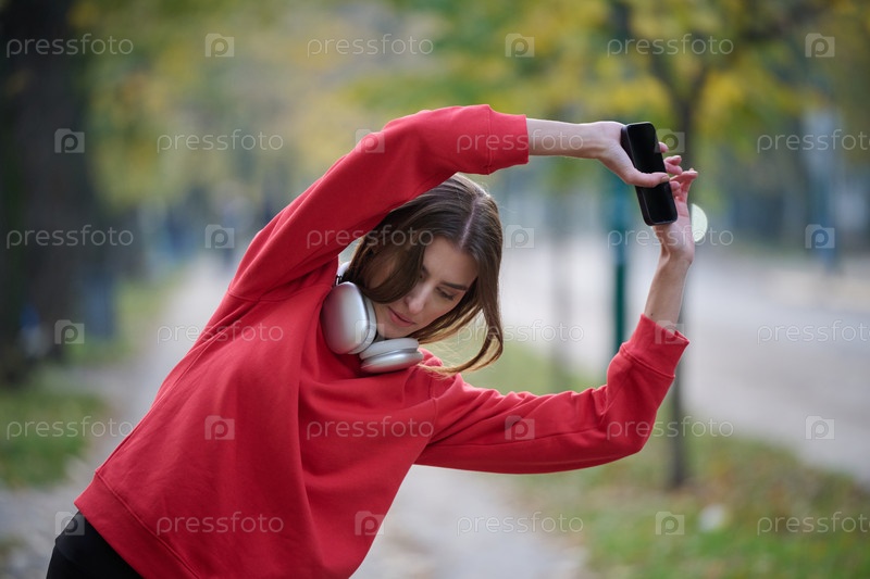 Спортивная молодая женщина делает вдох и расслабляется после пробежки и растяжки. Тренировка женщины и упражнения для тренировки на улице
