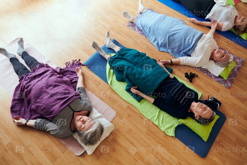 Группа пожилых женщин занимается различными упражнениями йоги, включая растяжку шеи, спины и ног, под руководством тренера в залитом солнцем месте, способствуя благополучию и гармонии