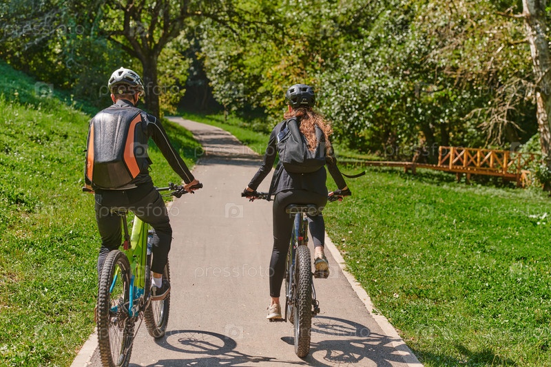 Счастливая пара, одетая в профессиональную велосипедную экипировку, наслаждается романтической велопрогулкой по парку, окруженному современными природными достопримечательностями, излучая любовь и счастье