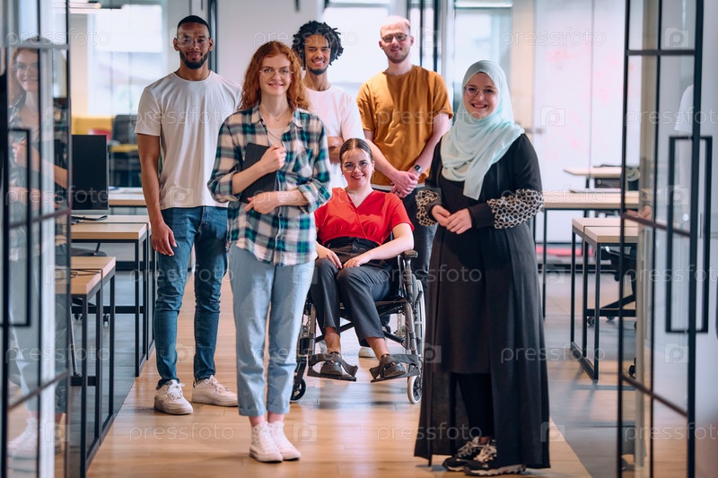 Группа молодых бизнесменов разного пола идет по коридору в застекленном офисе современного стартапа, среди них — человек в инвалидной коляске и женщина в хиджабе