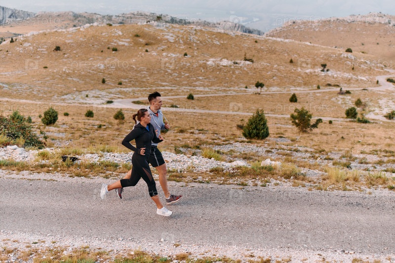 Пара в спортивной одежде бежит по живописной дороге во время утренней тренировки, наслаждаясь свежим воздухом и поддерживая здоровый образ жизни