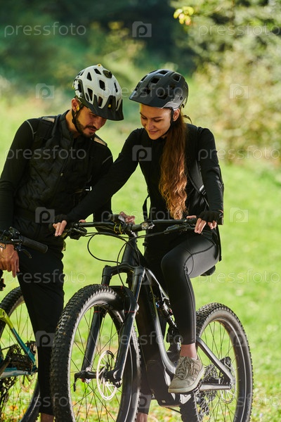 Счастливая пара, одетая в профессиональную велосипедную экипировку, наслаждается романтической велопрогулкой по парку, окруженному современными природными достопримечательностями, излучая любовь и счастье