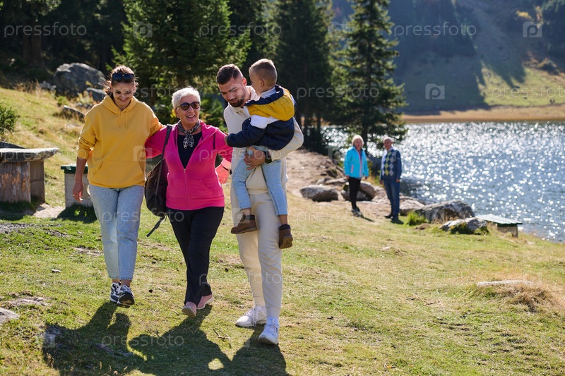 Семья разделяет прекрасные моменты с друзьями на фоне потрясающих пейзажей гор, озер и извилистых троп, пропагандируя здоровый образ жизни и радость семейных уз в объятиях красоты природы