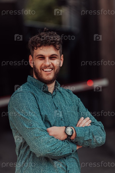 Успешный молодой бизнесмен в рубашке, скрестив руки, позирует на открытом воздухе с уверенным выражением лица