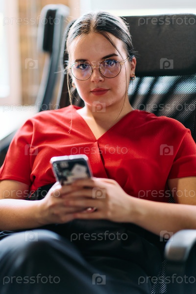 Бизнес-леди отдыхает во время короткого перерыва в работе в современном стартап-коворкинг-центре, используя свой смартфон, чтобы расслабиться и подзарядиться