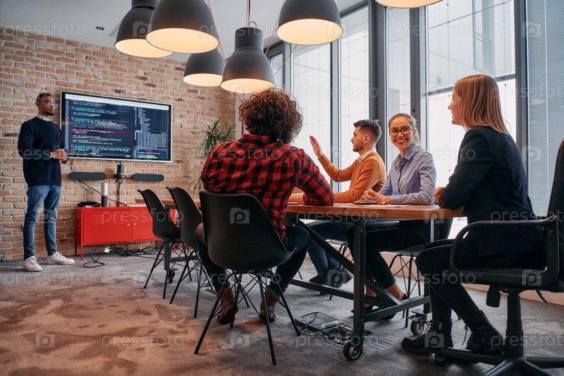 Афроамериканский бизнесмен проводит совещание, страстно представляя бизнес-план своей внимательной команде, способствуя сотрудничеству и стратегическому мышлению