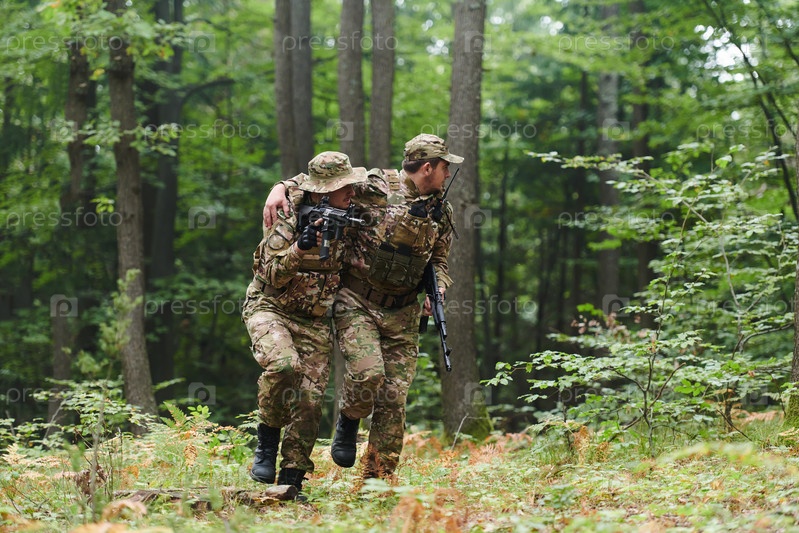 Элитный солдат демонстрирует непоколебимое товарищество и сострадание, помогая своему раненому товарищу, умело вынося его из леса на носилках, демонстрируя глубокую связь и бескорыстие внутри их военного братства