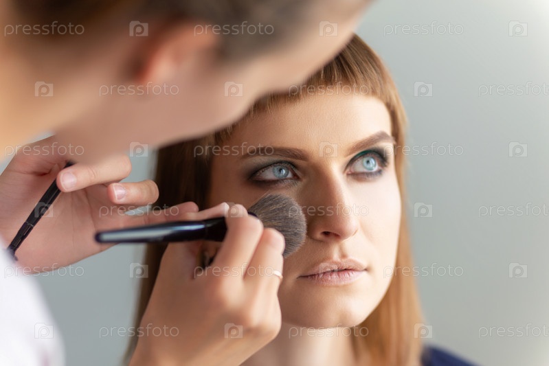 Опытный визажист тщательно добавляет последние штрихи к образу девушки-модели, подготавливая ее к захватывающей фотосессии, которая запечатлеет красоту и артистизм