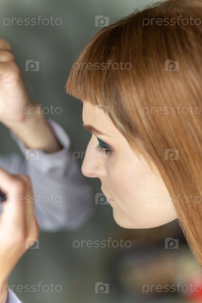 Портрет визажиста, делающего макияж девушке. Нанесение макияжа. Тени для век наносятся на кожу молодой женщины