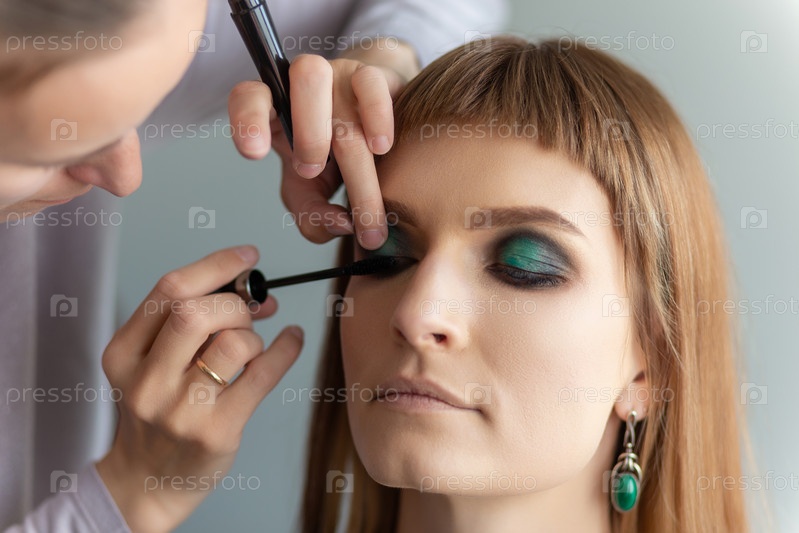 Портрет визажиста, делающего макияж девушке. Нанесение макияжа. Тени для век наносятся на кожу молодой женщины