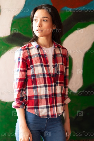 Портрет молодой красивой женщины в красной клетчатой рубашке в студии