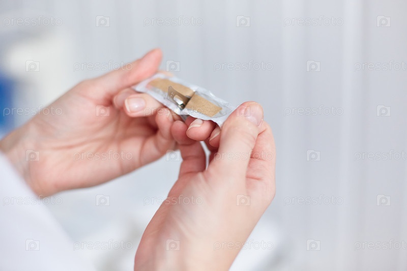 Врач открывает упаковку с лезвием. Дерматолог готовится сделать соскоб с кожи пациента. Крупный план