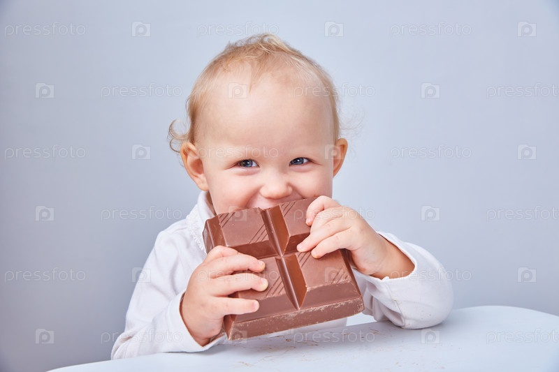Ребенок ест большой кусок шоколада. Концепция нездоровой пищи и здорового питания. Веганский шоколад
