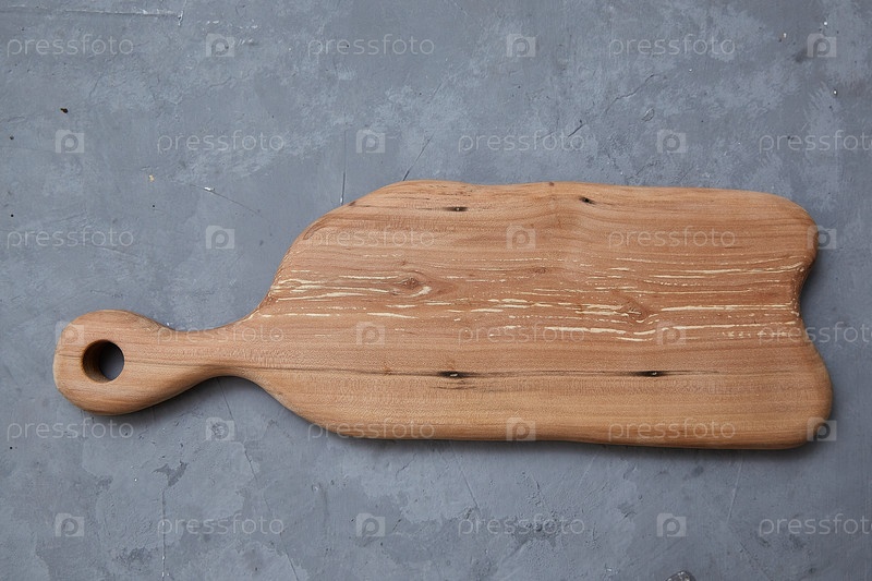 Пустая деревянная разделочная доска лежит на сером фоне. вид сверху, пространство для копирования