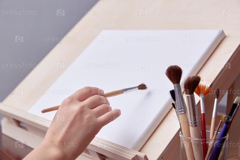 Художественная школа, рука художника возле картины. кисть крупным планом