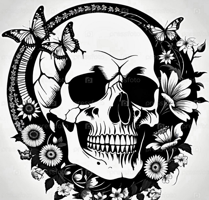 Человеческий череп, цветы и бабочки. граффити ИИ