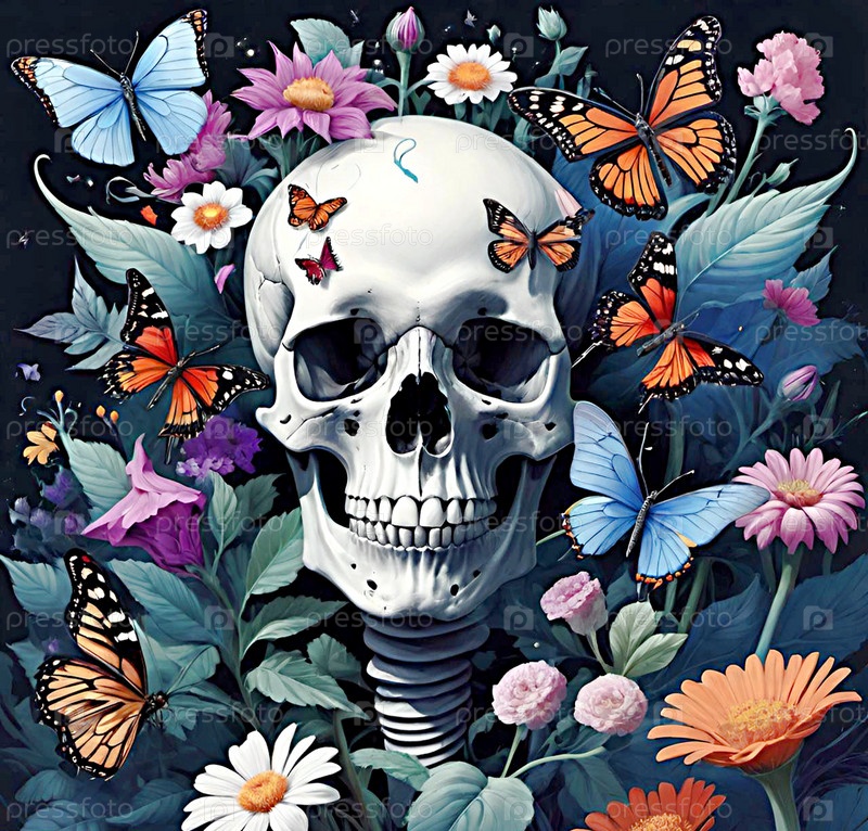 Человеческий череп, цветы и бабочки. граффити ИИ