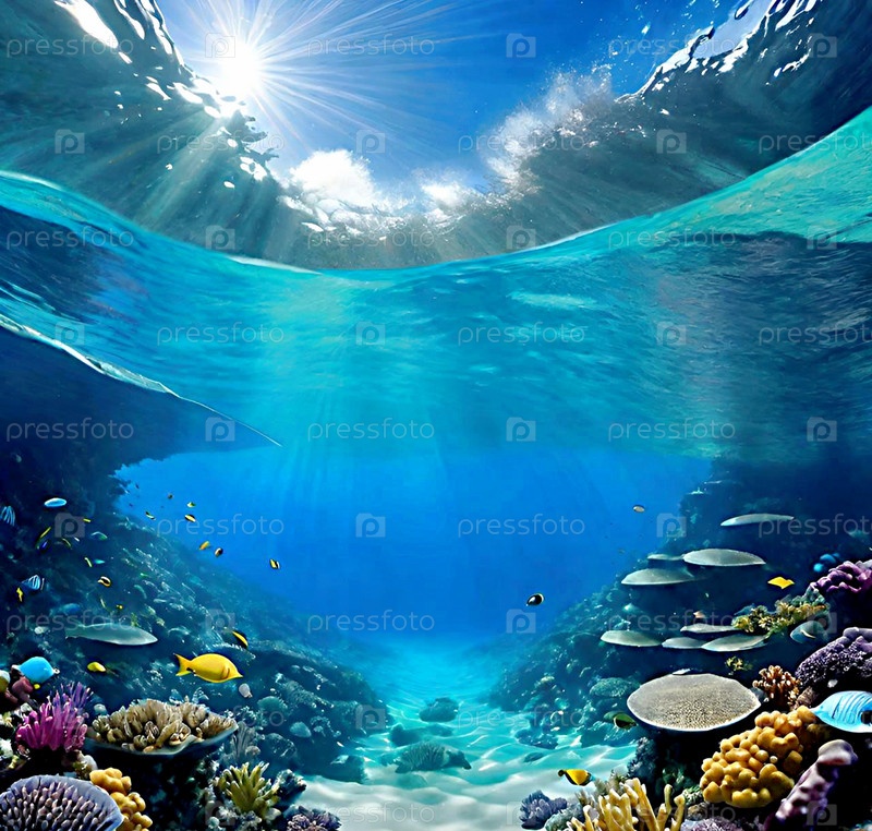 Вид со дна океана, водоема, подводный мир ИИ