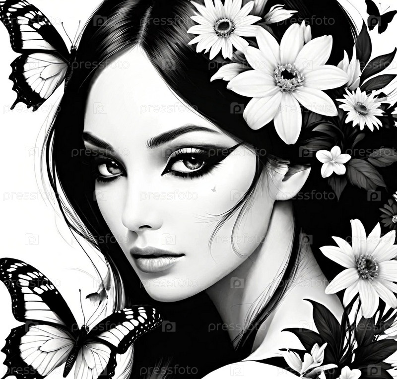Женский образ, цветы и бабочки. граффити ИИ