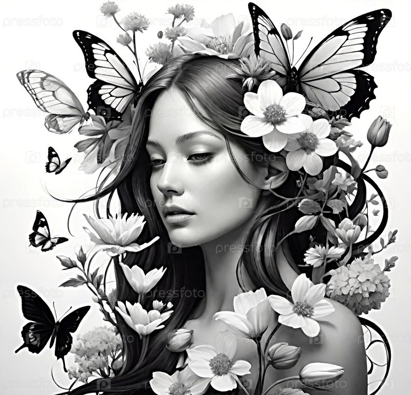 Женский образ, цветы и бабочки. граффити ИИ