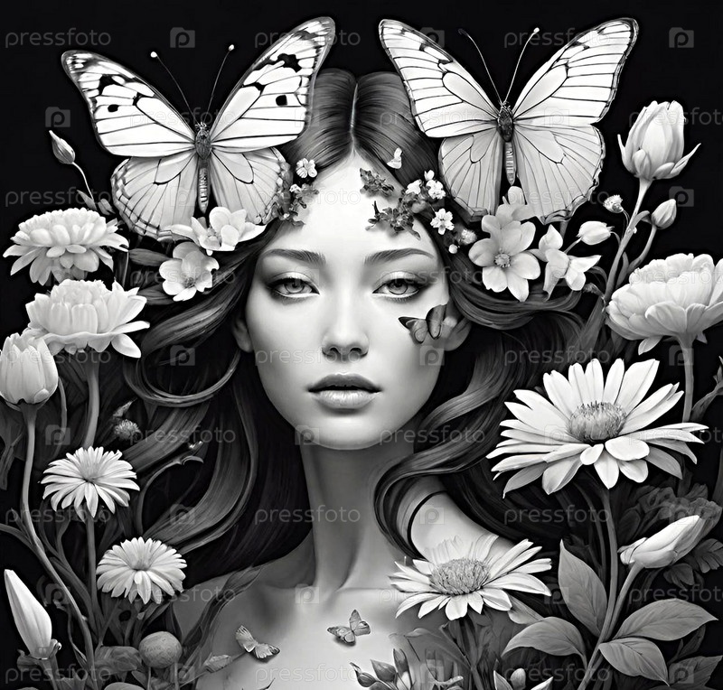 Женский образ, цветы и бабочки. граффити ИИ