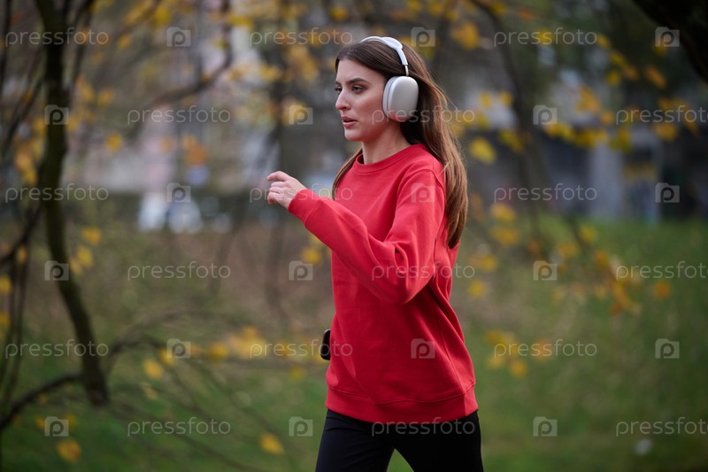 Молодая красивая женщина бежит в осеннем парке и слушает музыку в наушниках на смартфоне