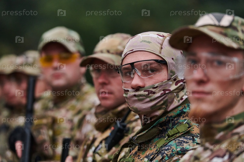 Солдаты-бойцы стоят вместе с оружием. Групповой портрет элитных членов армии США, военнослужащих частной военной компании, антитеррористического отряда