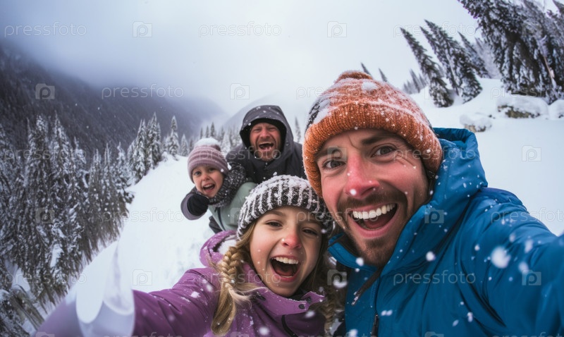 Ликующая семья запечатлела суть своих радостных зимних каникул, сделав веселое селфи на фоне заснеженного живописного горного пейзажа