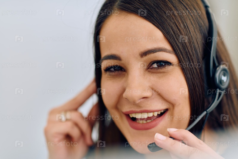 Дружелюбный агент колл-центра отвечает на входящие звонки с помощью гарнитуры и обеспечивает удаленное обслуживание клиентов
